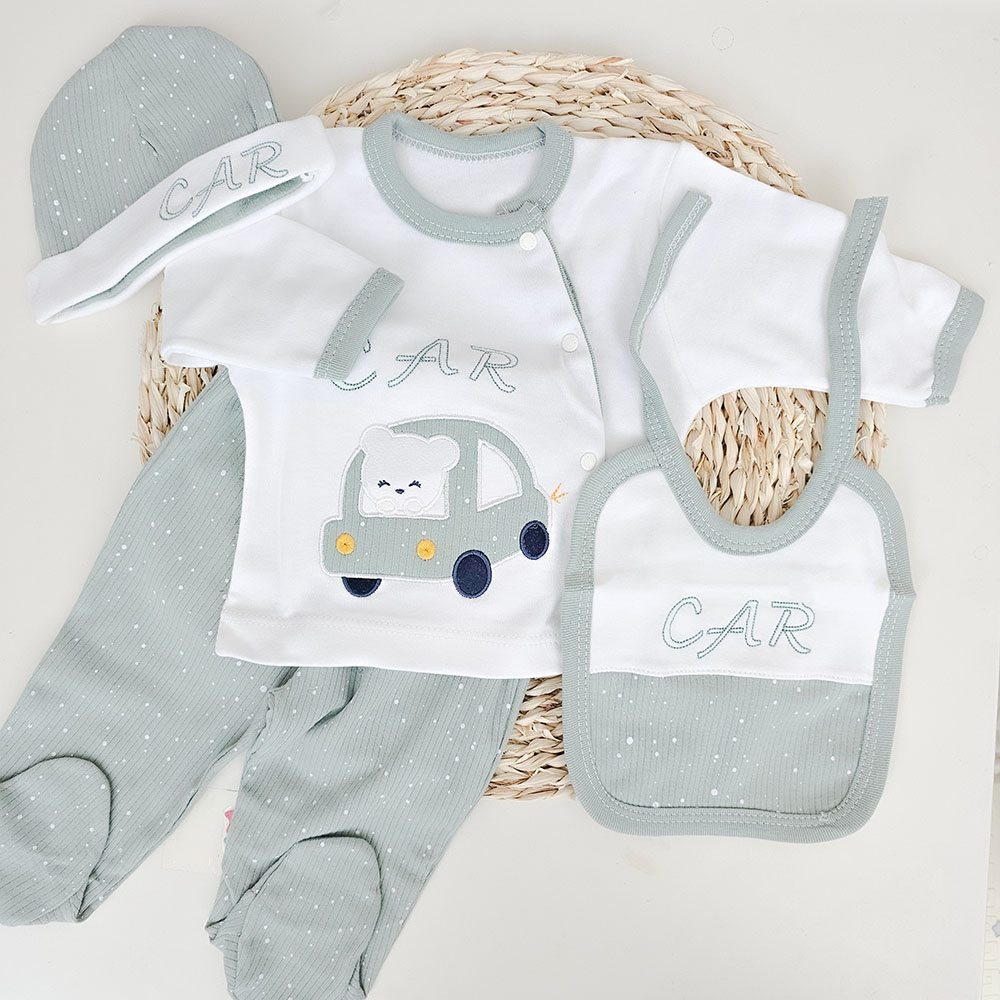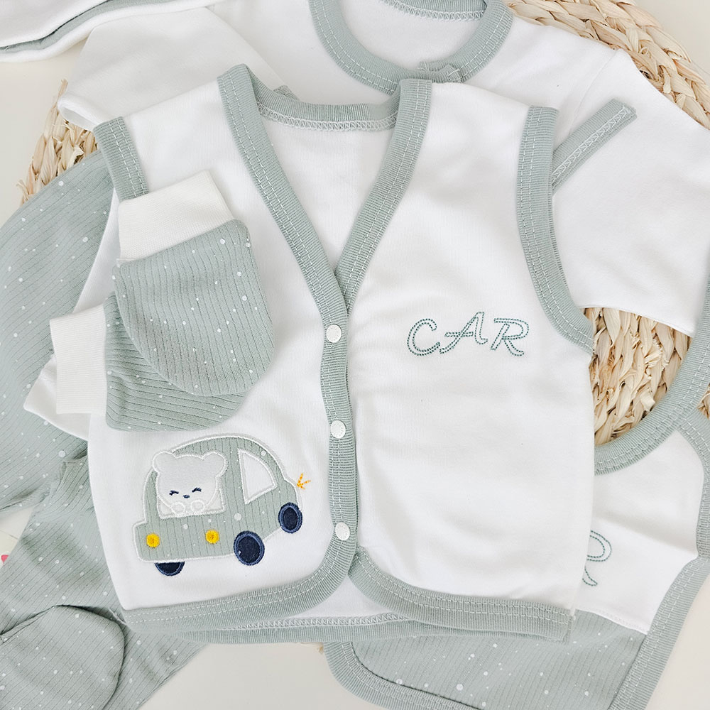 Setul include o gama variata de haine si accesorii pentru un nou-nascut, cum ar fi body cu maneca lunga, pantalonasi cu botosei, bluza de corp cu maneca lunga, bluza cu capse, vestuta cu capse, manusi, caciulita, batistuta si paturica din bumbac. Toate acestea sunt esentiale pentru a mentine bebelusul confortabil.