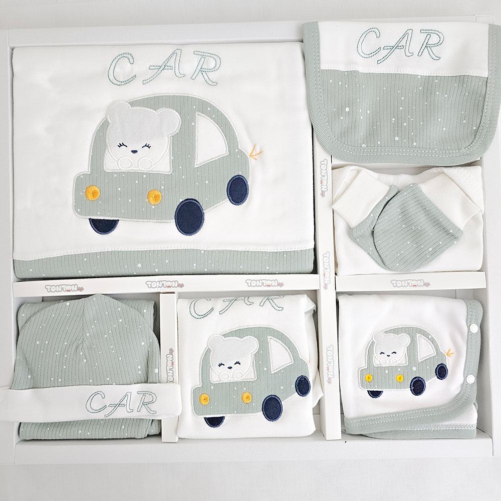 Setul este ambalat intr-o cutie frumoasa, ceea ce il face potrivit pentru a fi oferit ca un cadou la o nastere. Ambalajul atragator adauga o nota speciala si poate fi o surpriza minunata pentru proaspetii parinti.