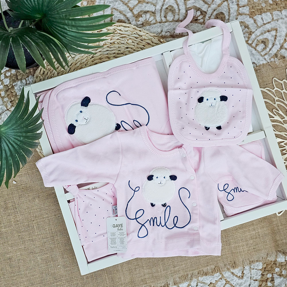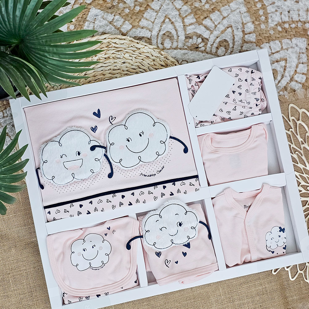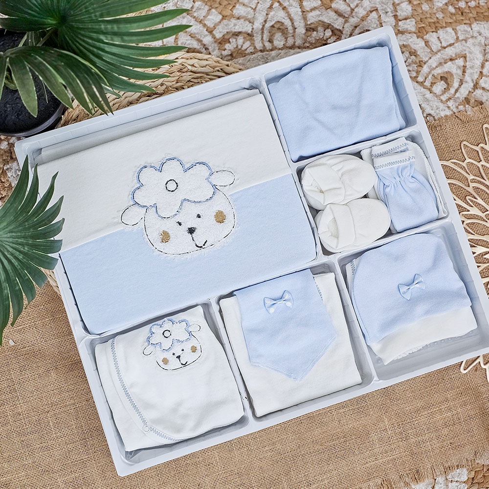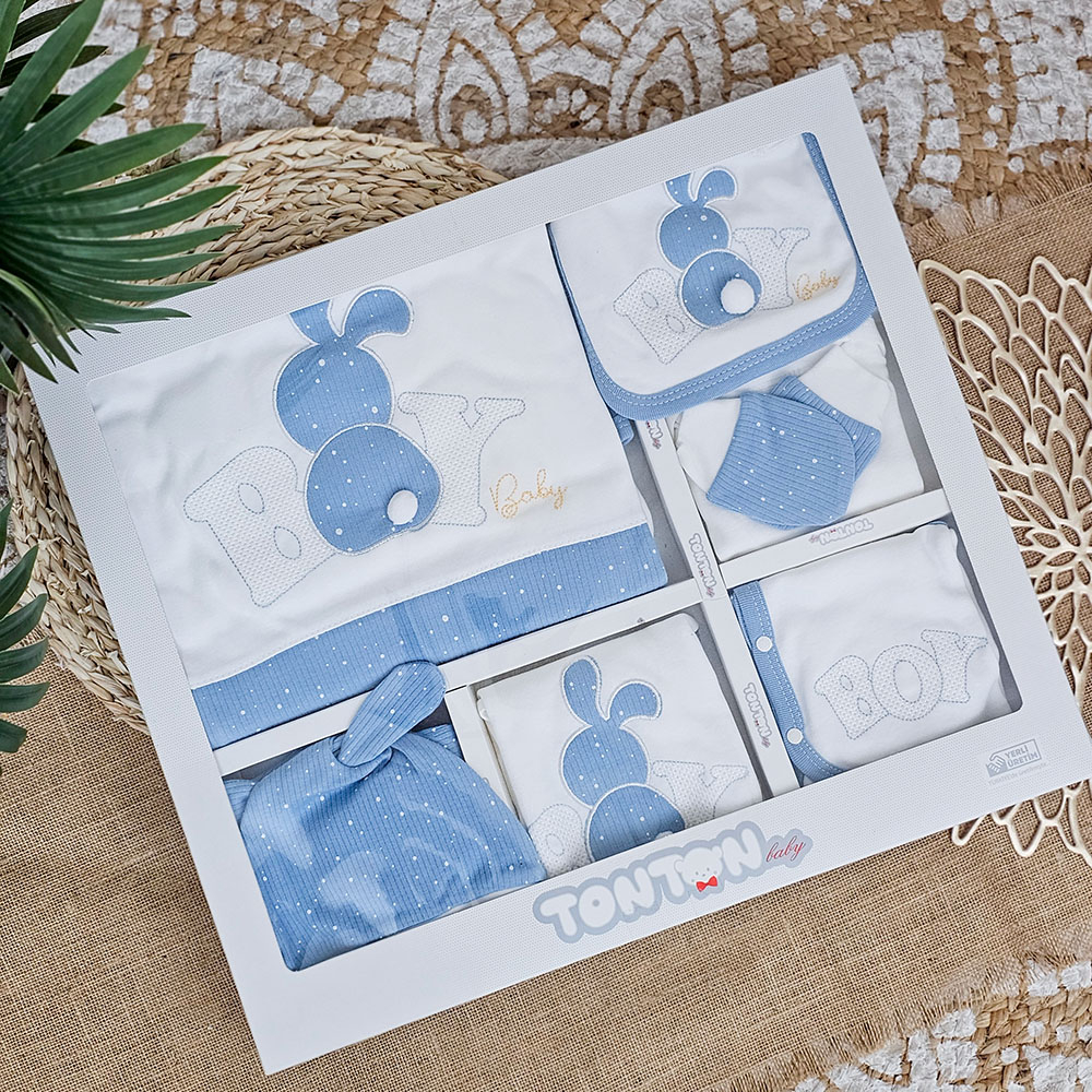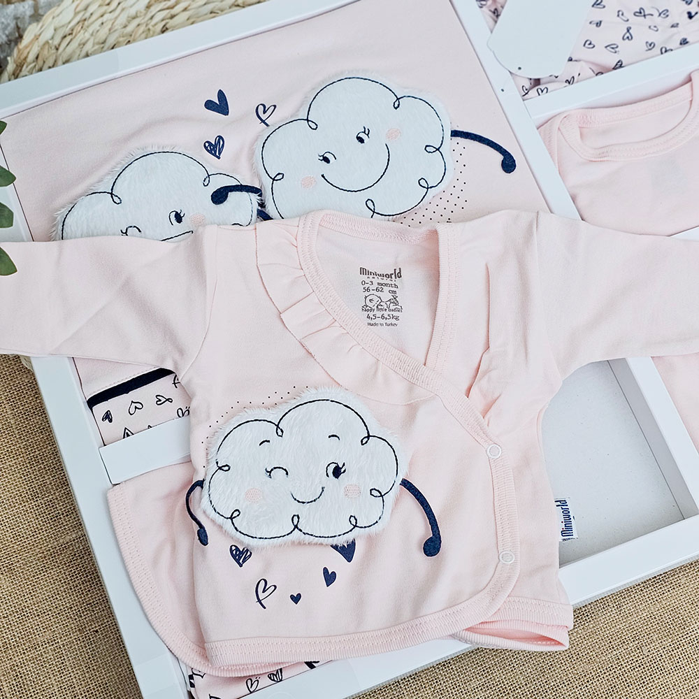 Setul Cadou Nou-nascut: set maternitate contine: body cu maneca lunga, pantalonasi cu butusei, bluza de corp cu maneca lunga, bluza cu capse, vestuta cu capse, manusi, caciulita, batistuta, babetica si paturica din bumbac.