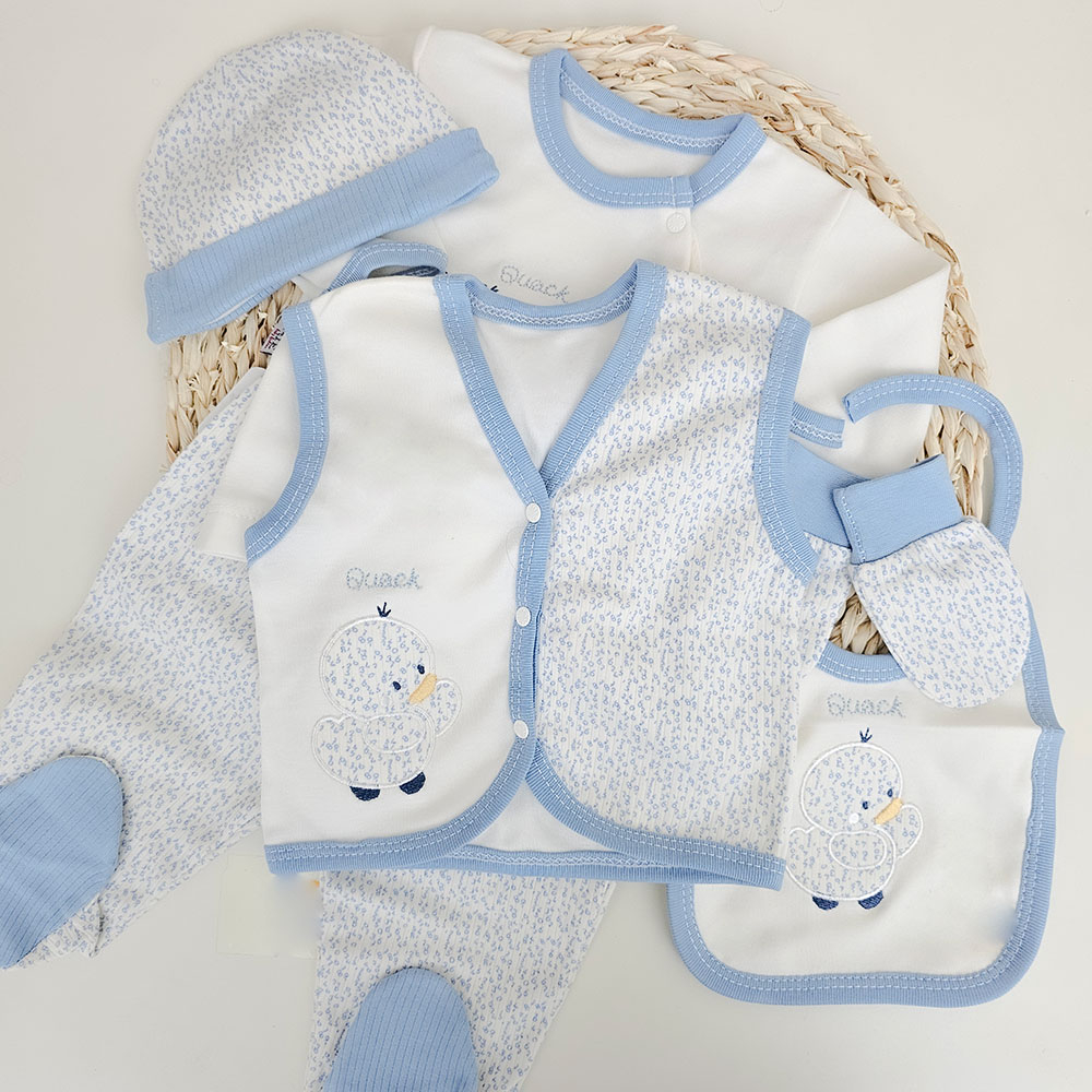Setul include o gama variata de haine si accesorii pentru un nou-nascut, cum ar fi body cu maneca lunga, pantalonasi cu botosei, bluza de corp cu maneca lunga, bluza cu capse, vestuta cu capse, manusi, caciulita, batistuta si paturica din bumbac. Toate acestea sunt esentiale pentru a mentine bebelusul confortabil.