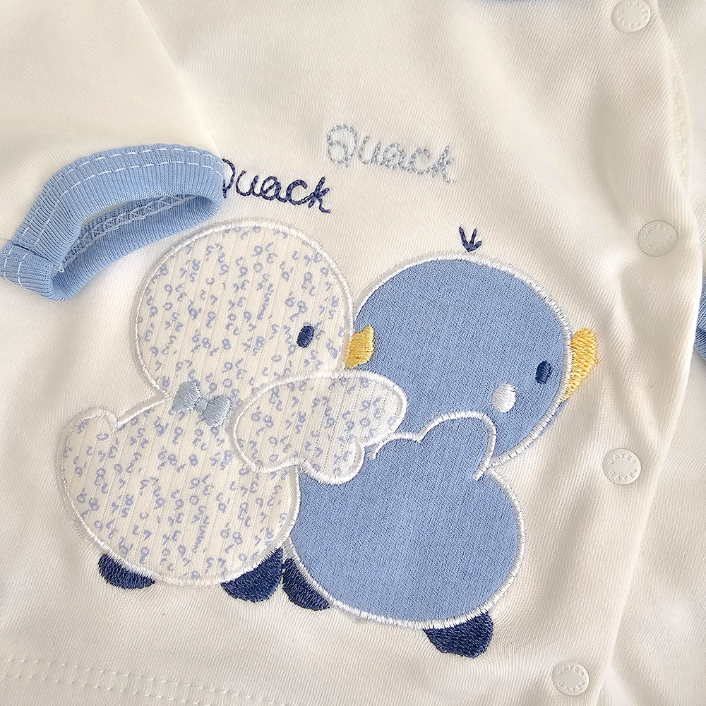 Hainele sunt confectionate din bumbac 100% cu certificare Oeko-Tex. Acest lucru inseamna ca aceste produse textile sunt create din materiale sigure si non-toxice, ceea ce este deosebit de important pentru pielea sensibila a nou-nascutilor. Certificarea Oeko-Tex este un standard recunoscut la nivel international pentru calitatea si siguranta materialelor textile.
