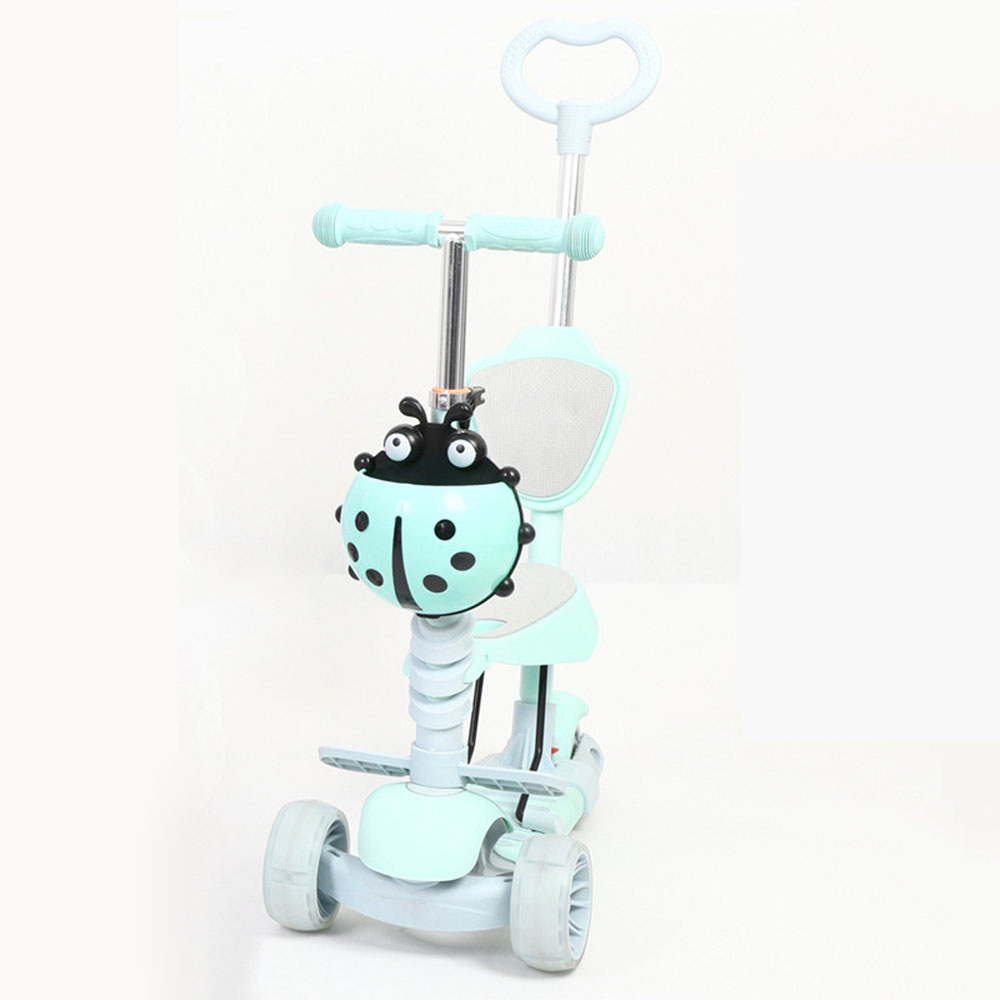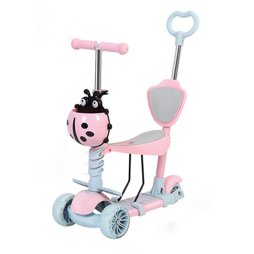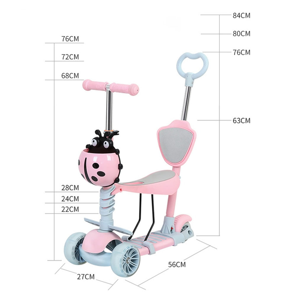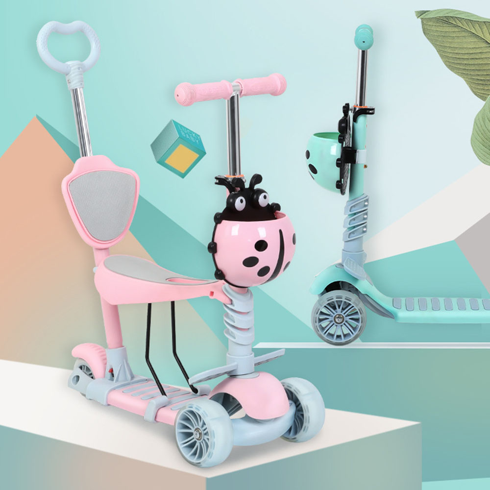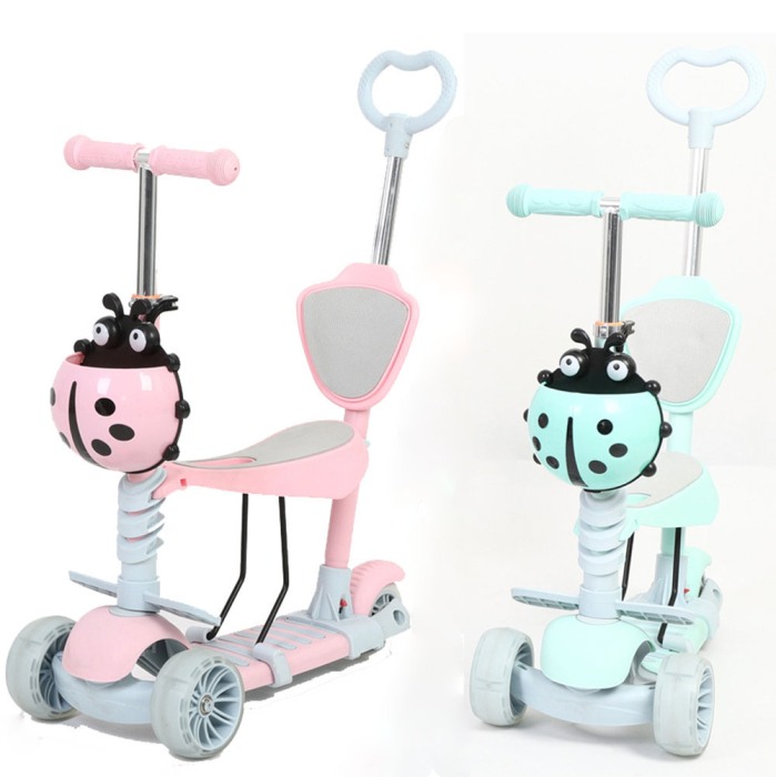 Trotineta evolutiva 5 in 1 cu scaunel si spatar detasabile, roti siliconice prevazute cu leduri functionale in timpul rularii.