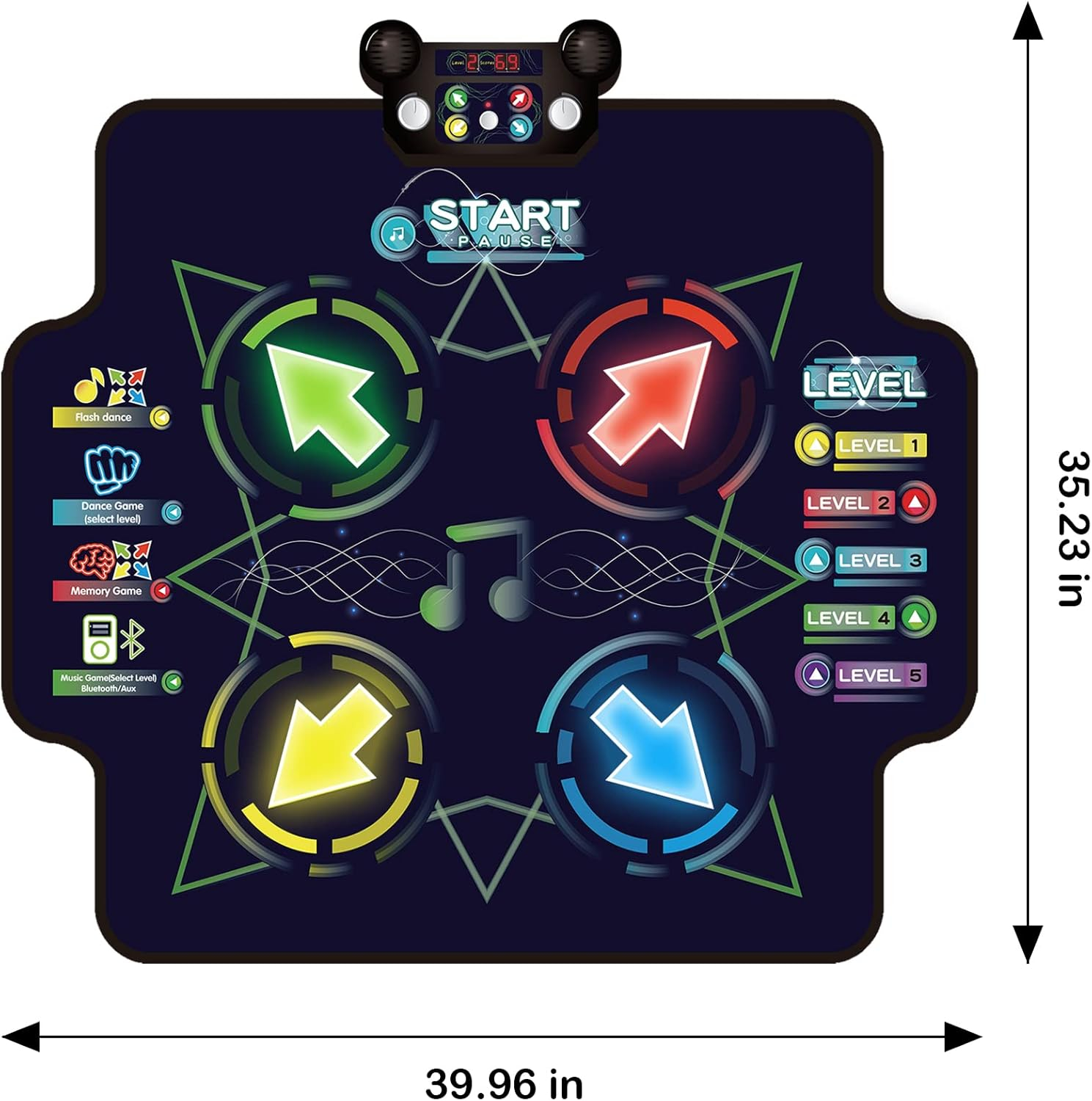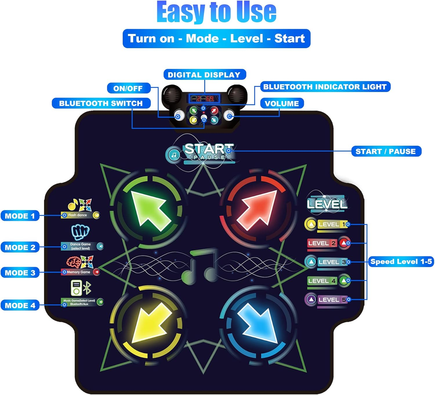 Pregatiti-va pentru ore de distractie si miscare cu Covorasul de Dans LED JOLLY FUN! Creat pentru a atrage copiii in lumea muzicii si a dansului, acest covoras interactiv este perfect pentru baieti si fete cu varste intre 4 si 10 ani. Cu 4 moduri de joc si 5 nivele de viteza ajustabile, acest covoras este o modalitate excelenta de a incuraja exercitiul, coordonarea si timpul petrecut in familie. Fie ca e o petrecere de dans solo sau un concurs amical, acest covoras transforma orice spatiu intr-o mini pista de dans!