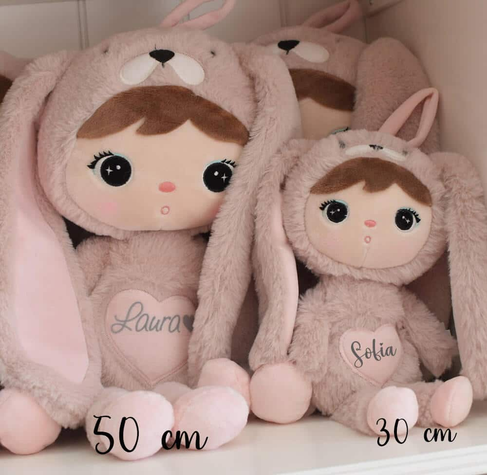 Cu urechile sale dragalase de iepuras si dimensiunea sa de 30 cm, aceasta papusa este confectionata din plus moale si se personalizeaza cu numele copilului, facandu-l un cadou special si unic.